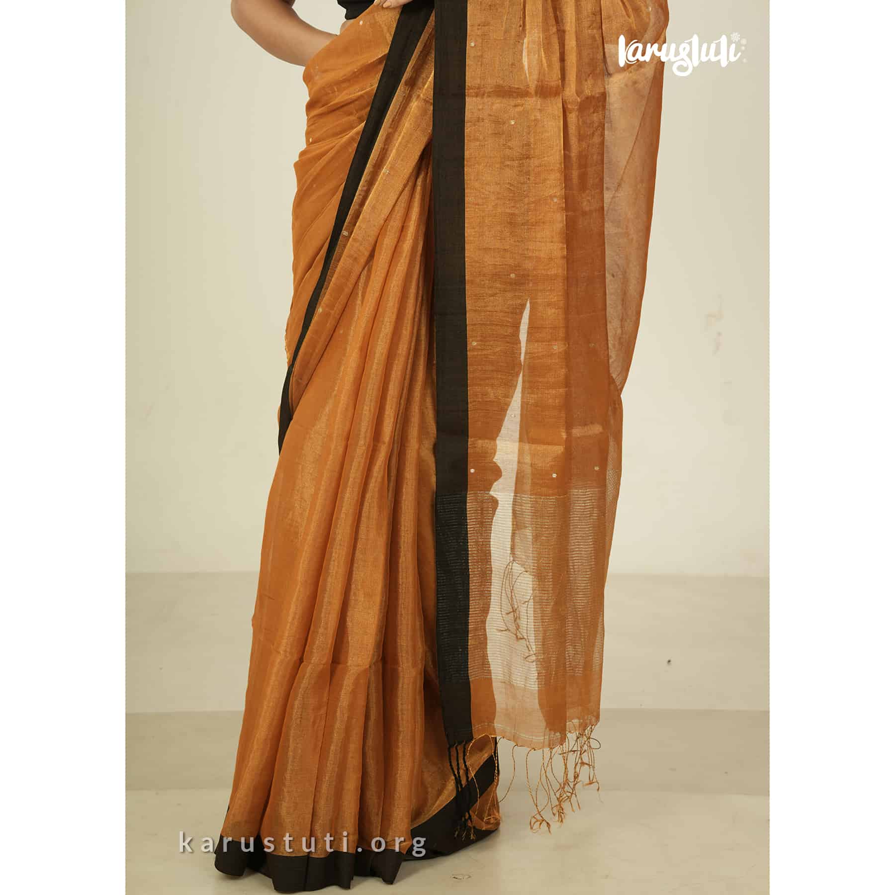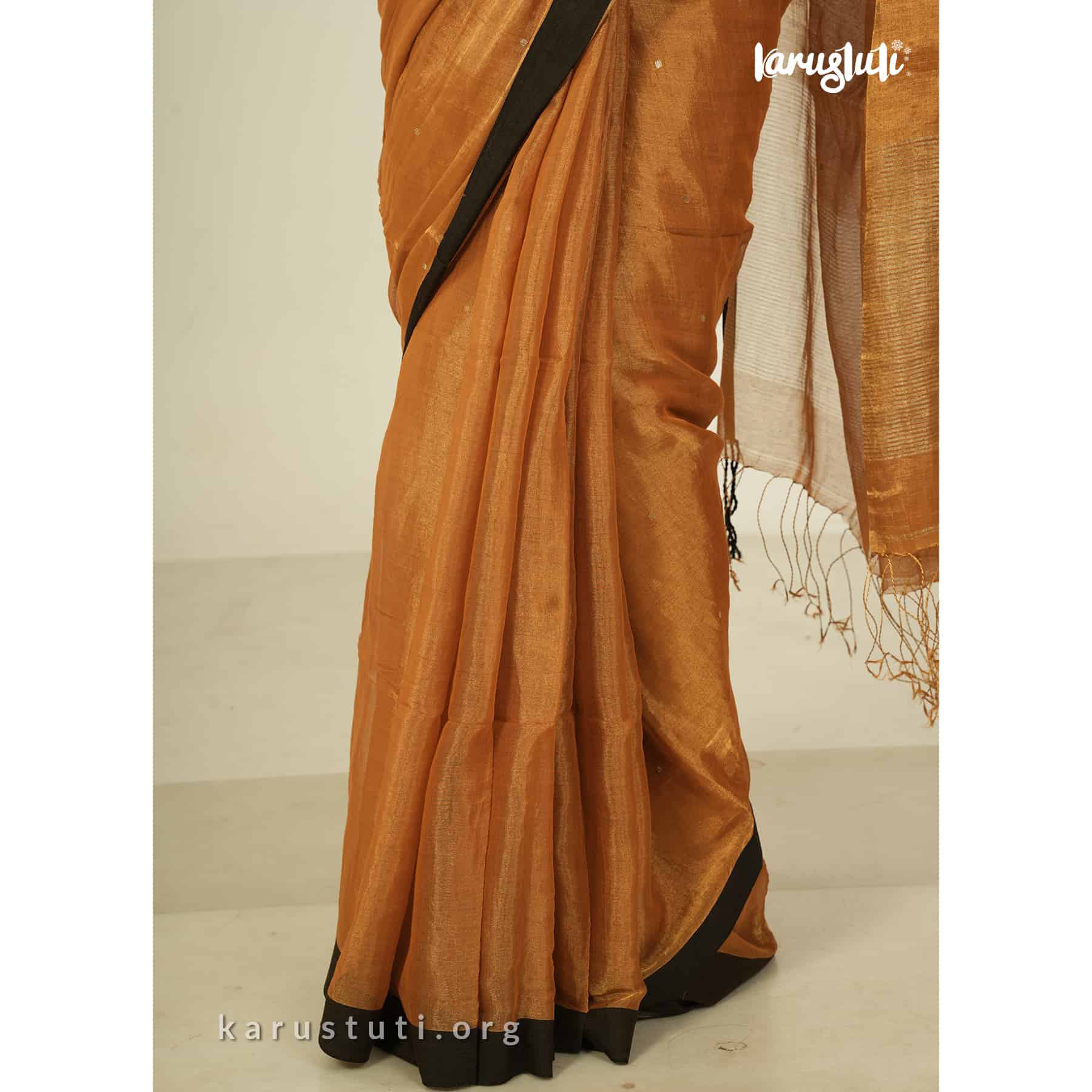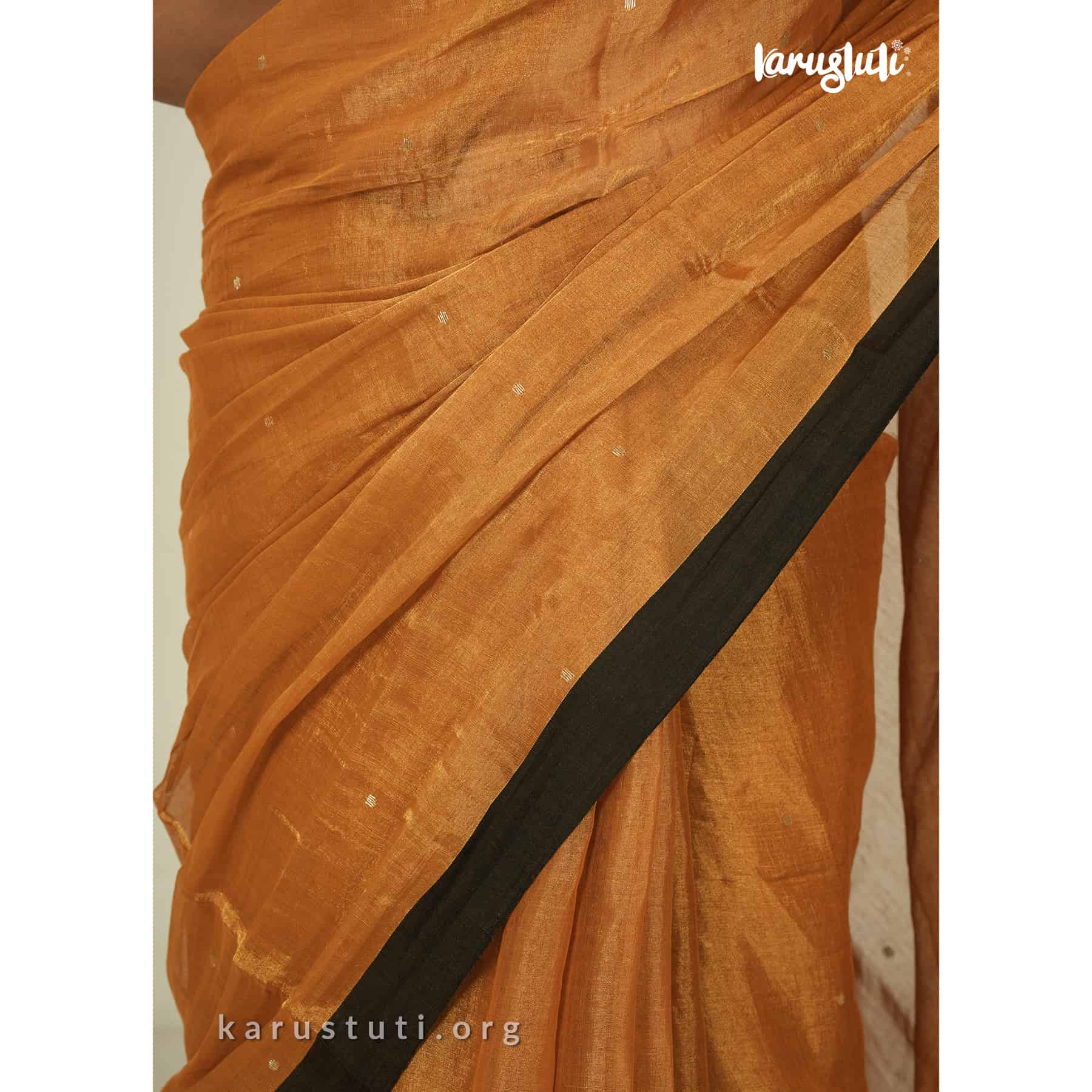 Metallic 6 yards with tested tissue in warps and weft has linen cotton blended weaving . feather soft , breathable metallic has all over buta and contrast silk border. this saree took 6 to 7 days to complete . AZO & PCP free color is best for all type of party and occasions .