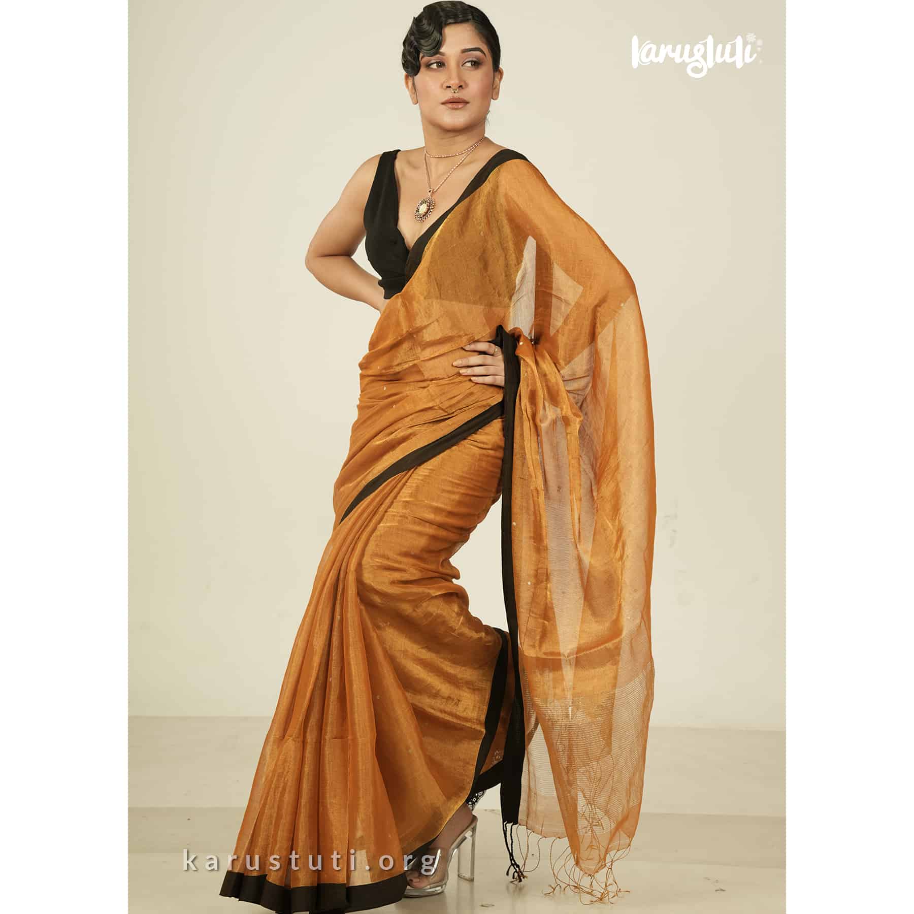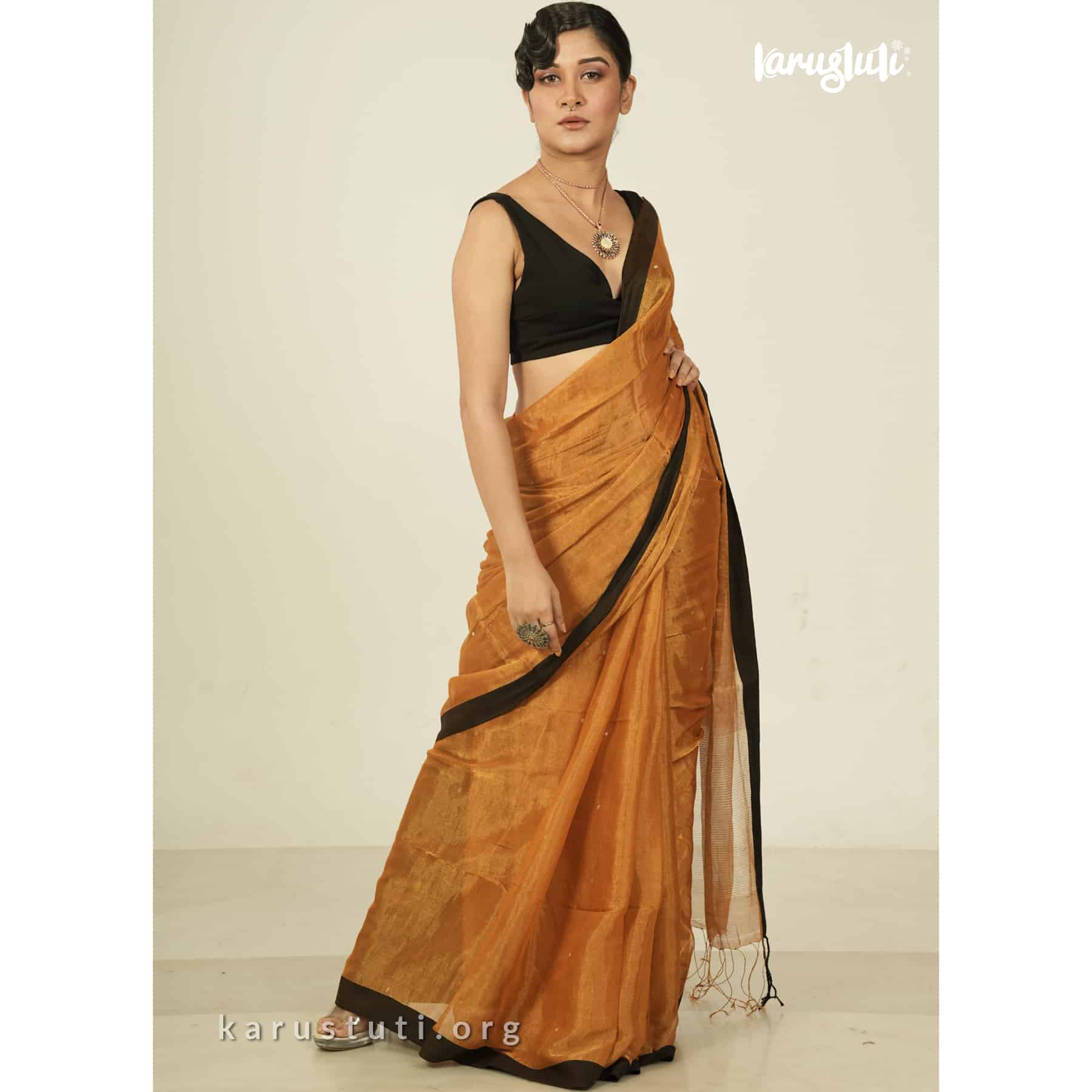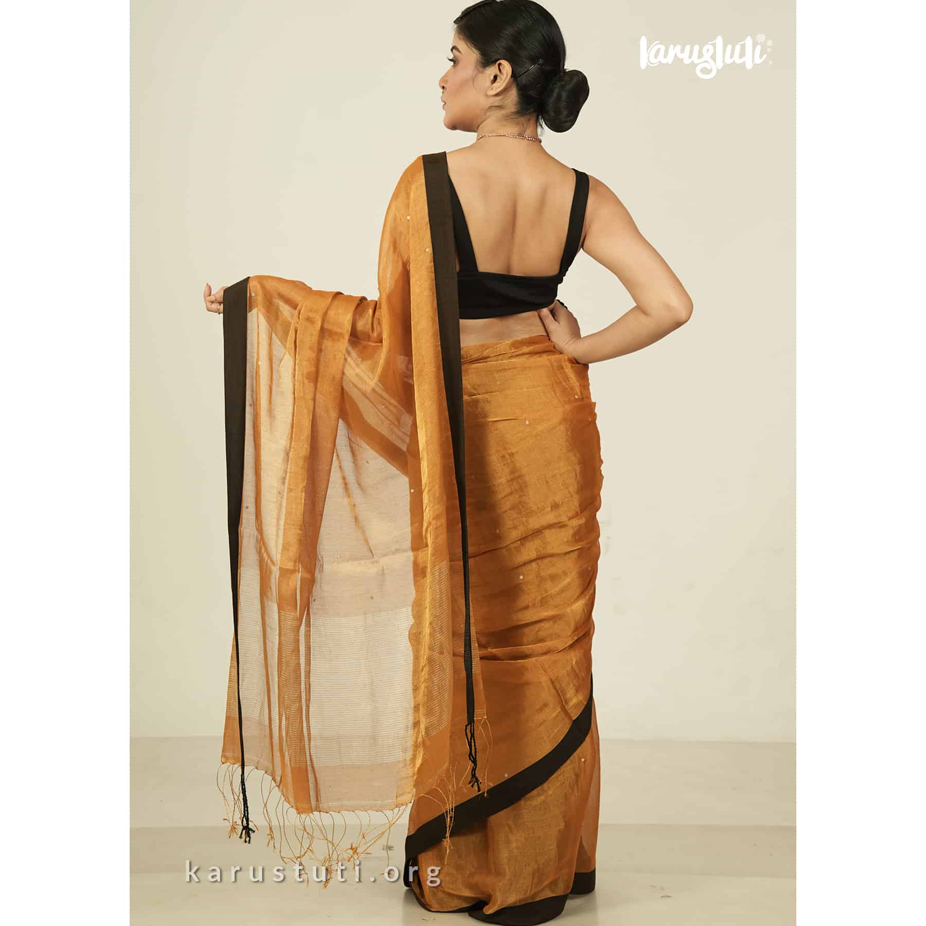 Metallic 6 yards with tested tissue in warps and weft has linen cotton blended weaving . feather soft , breathable metallic has all over buta and contrast silk border. this saree took 6 to 7 days to complete . AZO & PCP free color is best for all type of party and occasions .