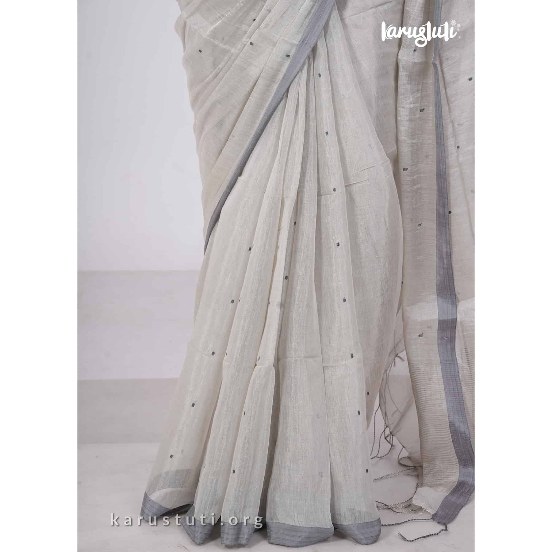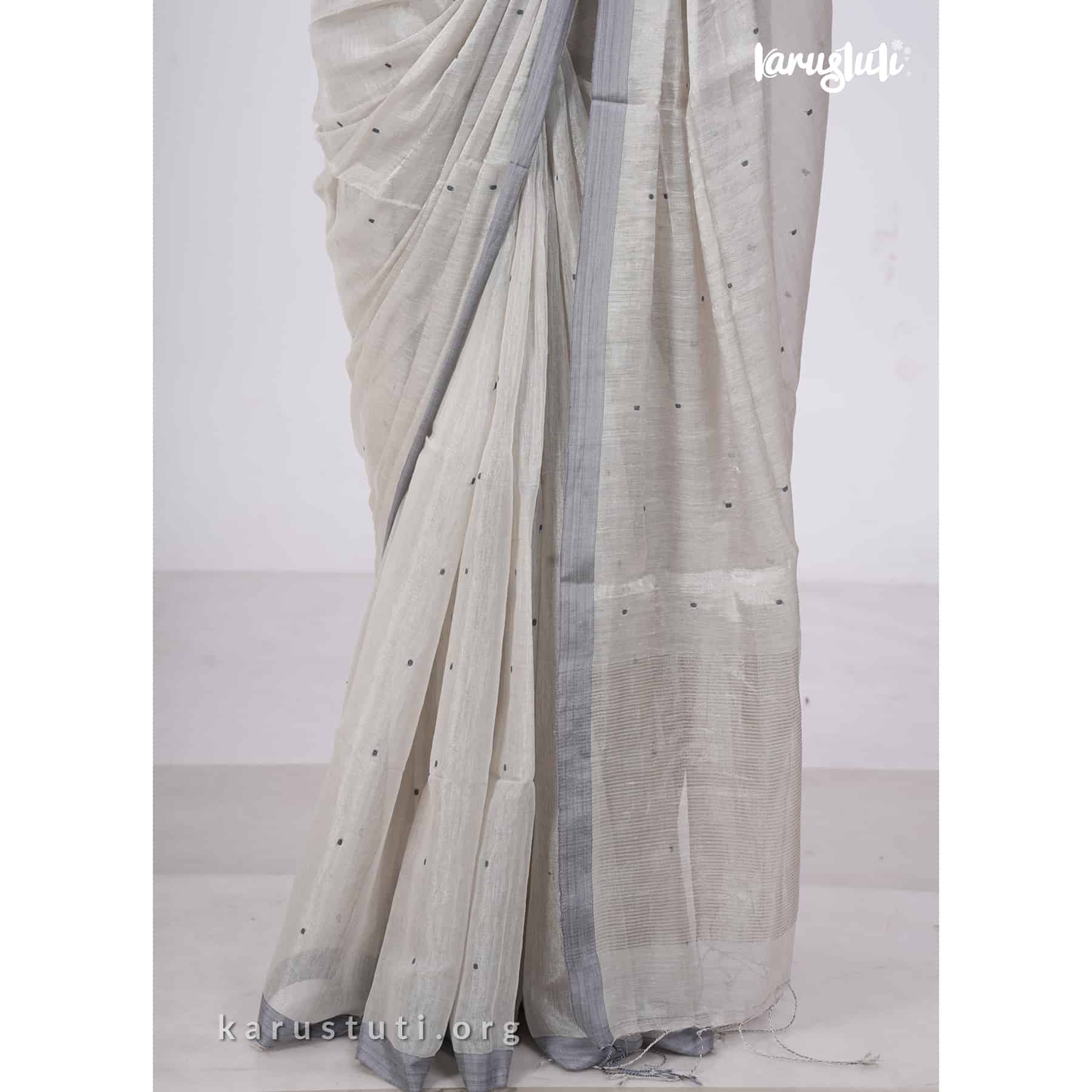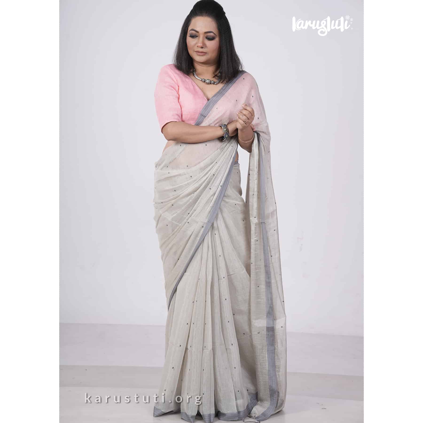 Metallic 6 yards with tested tissue in warps and weft has linen cotton blended weaving . feather soft , breathable metallic has all over buta and contrast silk border. this saree took 6 to 7 days to complete . AZO & PCP free color is best for all type of party and occasions .