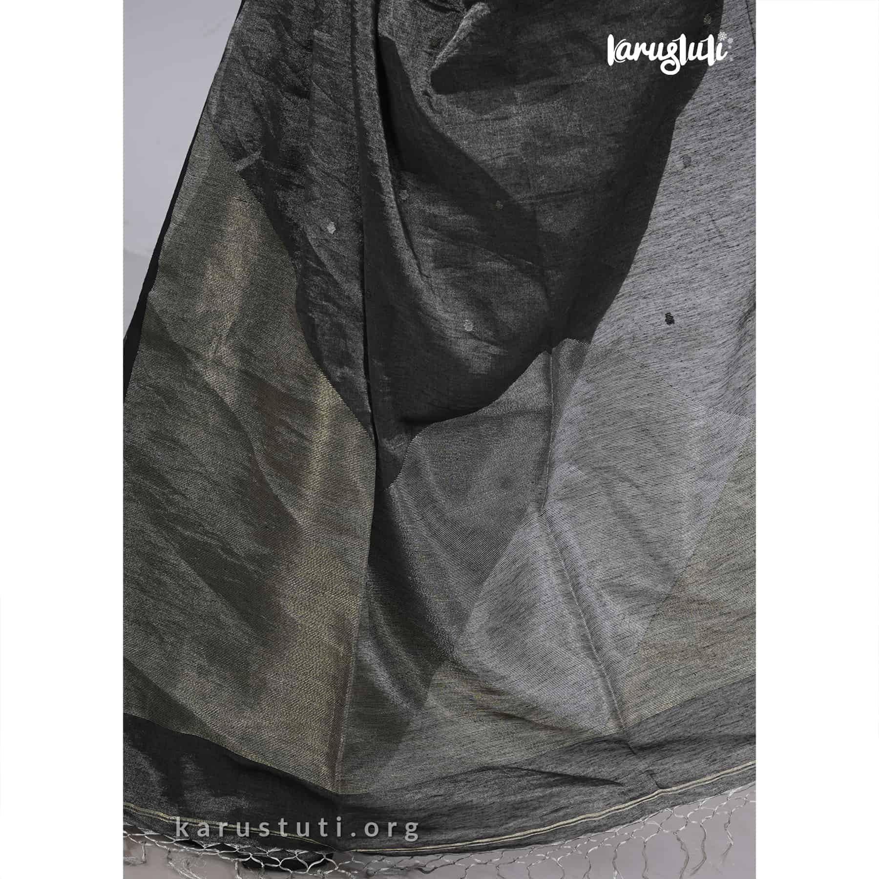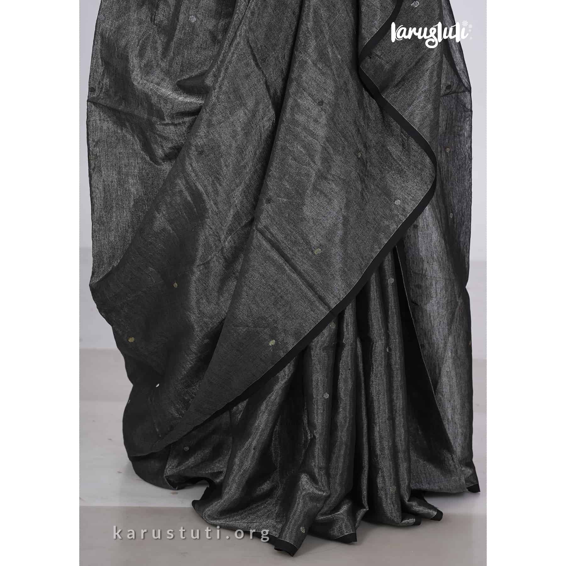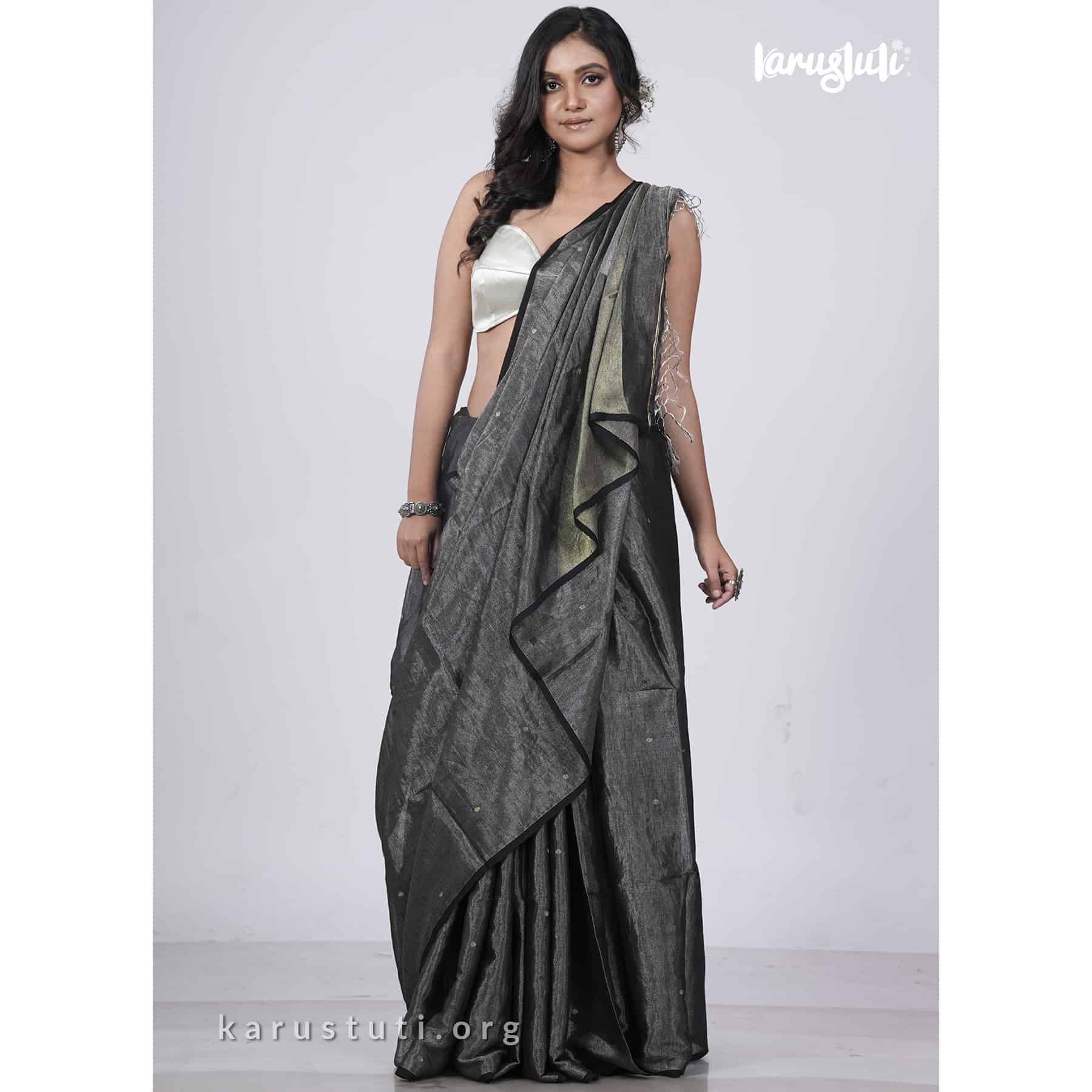 Metallic 6 yards with tested tissue in warps and weft have linen cotton blended weaving. Feather soft, breathable metallic has all over buta and contrast border and handwoven geometric jamdani pallu. this saree took 6 to 7 days to complete. AZO & PCP free color is best for all types of parties and occasions.