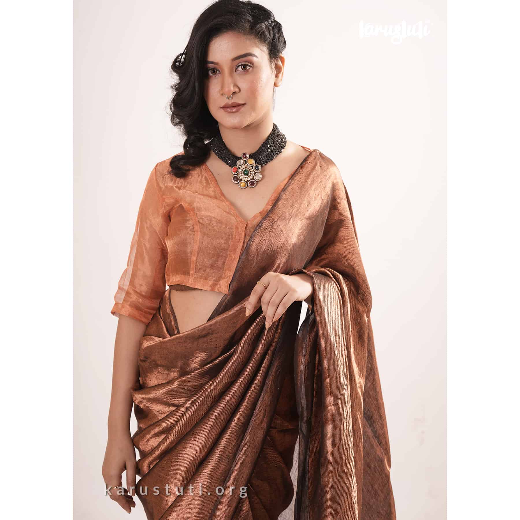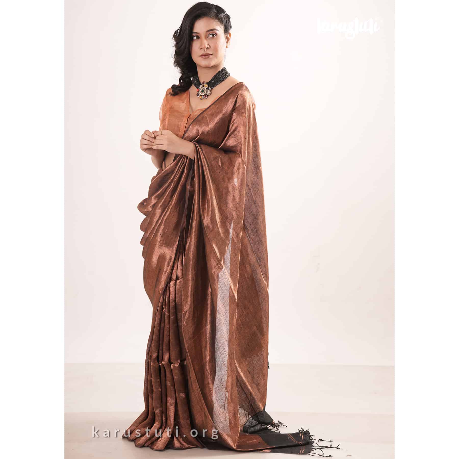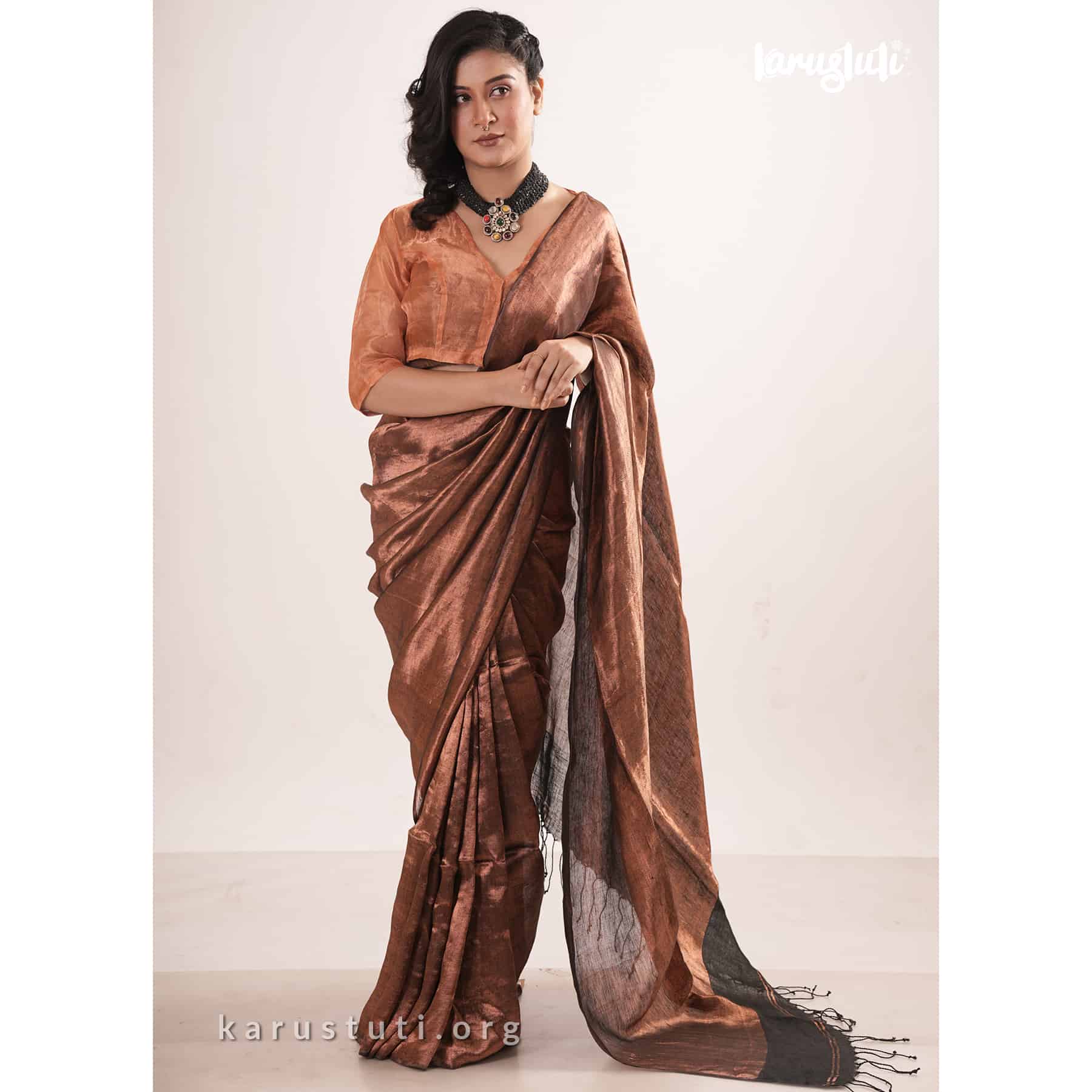 80 CNT fine linen with all-over twisted 3-ply tissue weaving, twisted pattern with linen gives you nice fall and ultimate festive wear. This saree takes 7 days to complete. AZO and PCP free color. Starch not require.