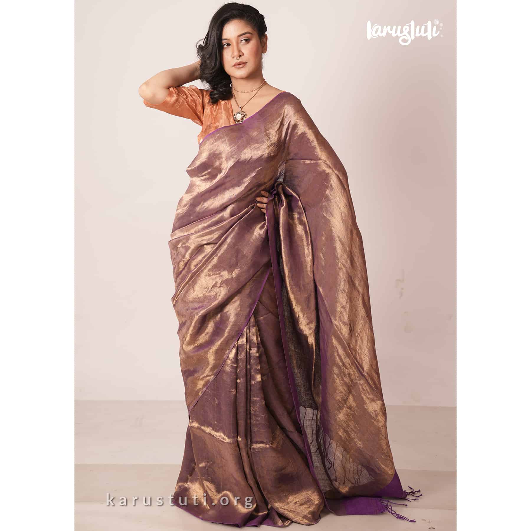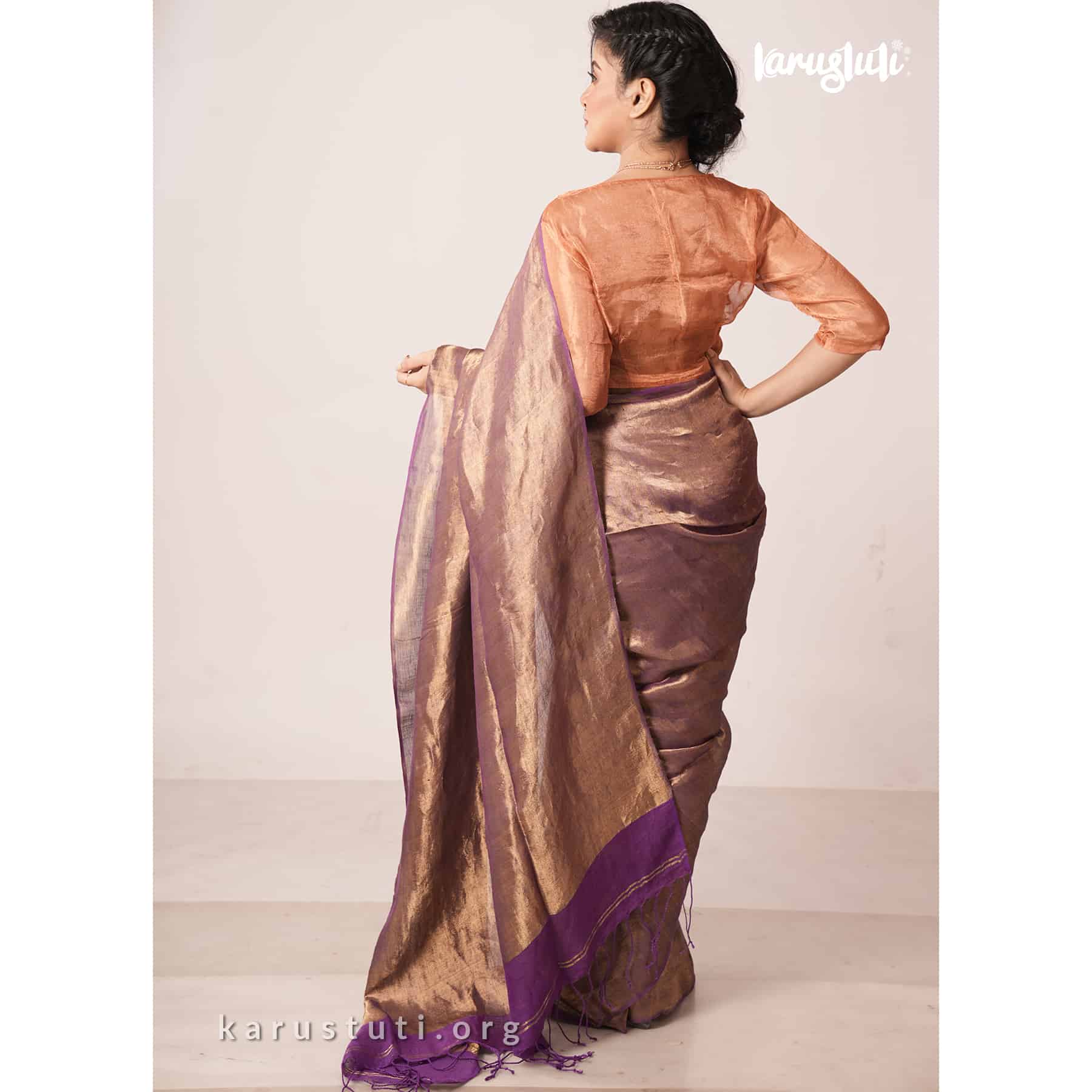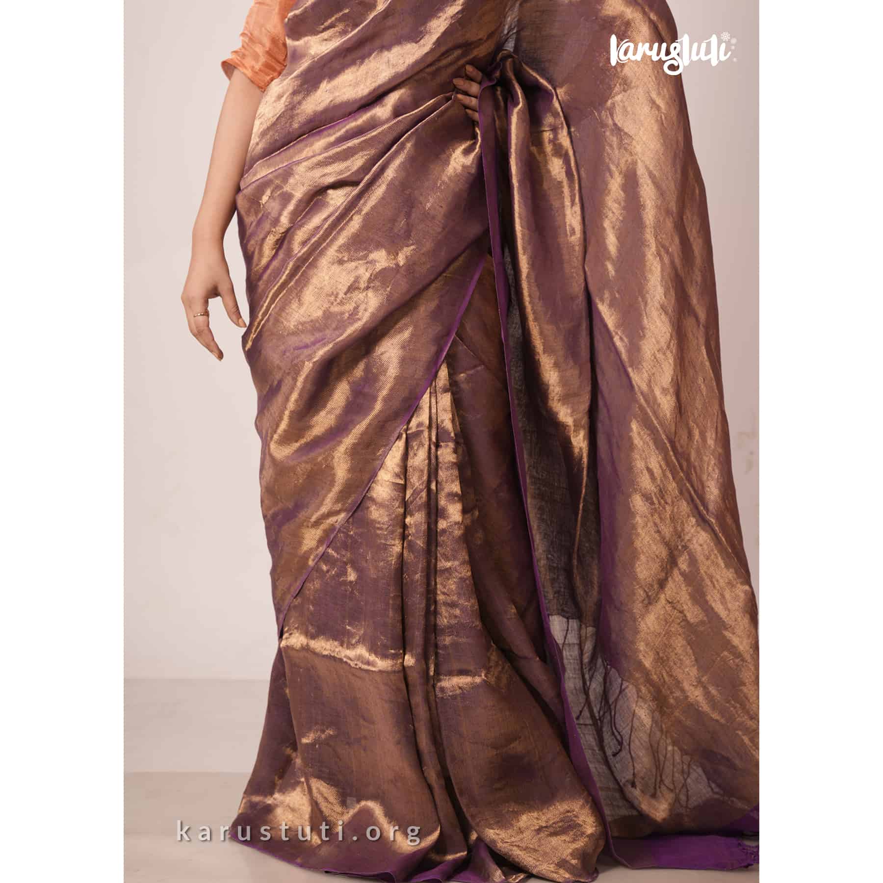 80 CNT fine linen with all-over twisted 3-ply tissue weaving, twisted pattern with linen gives you nice fall and ultimate festive wear. This saree takes 7 days to complete. AZO and PCP free color. Starch not require.