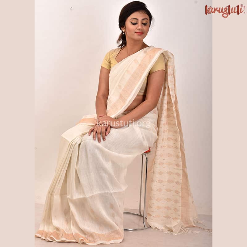 80cnt linen with zari (tested silk zari) nakshi buta weaving in both of the borders, along with nakshi buta hand jamdani pallu. This saree takes 7 to 9 days to complete. AZO & PCP free natural non-allergic color. Rich and ravishing look for party wear. Best for all occassion, starch not require.