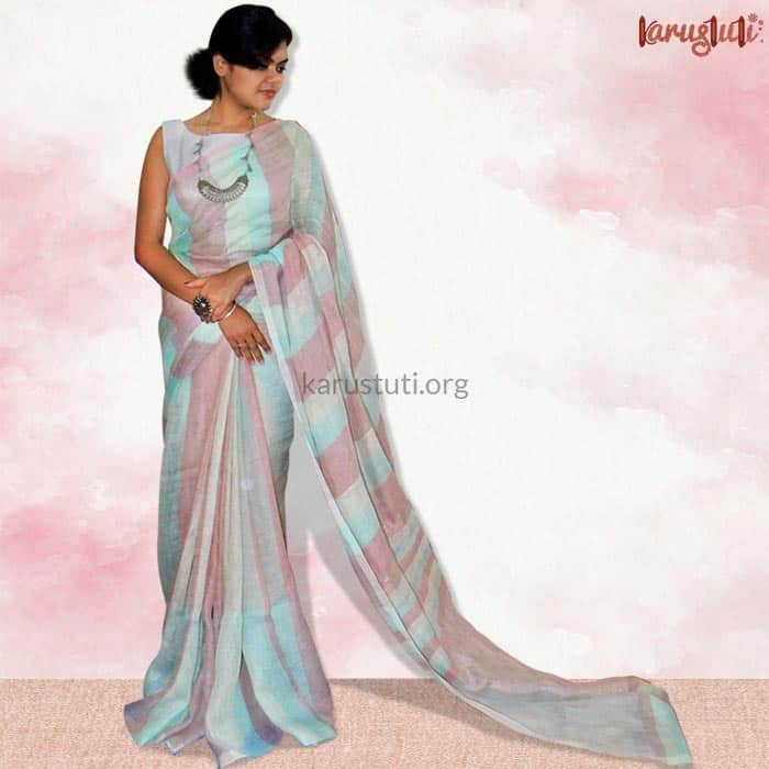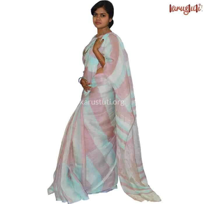 100 CNT fine linen handloom saree with summer shade stripe design pattern all over saree, tested zari in pallu. This saree takes 3 days to complete. AZO & PCP free colour, a smart piece for any time. Starch not required.