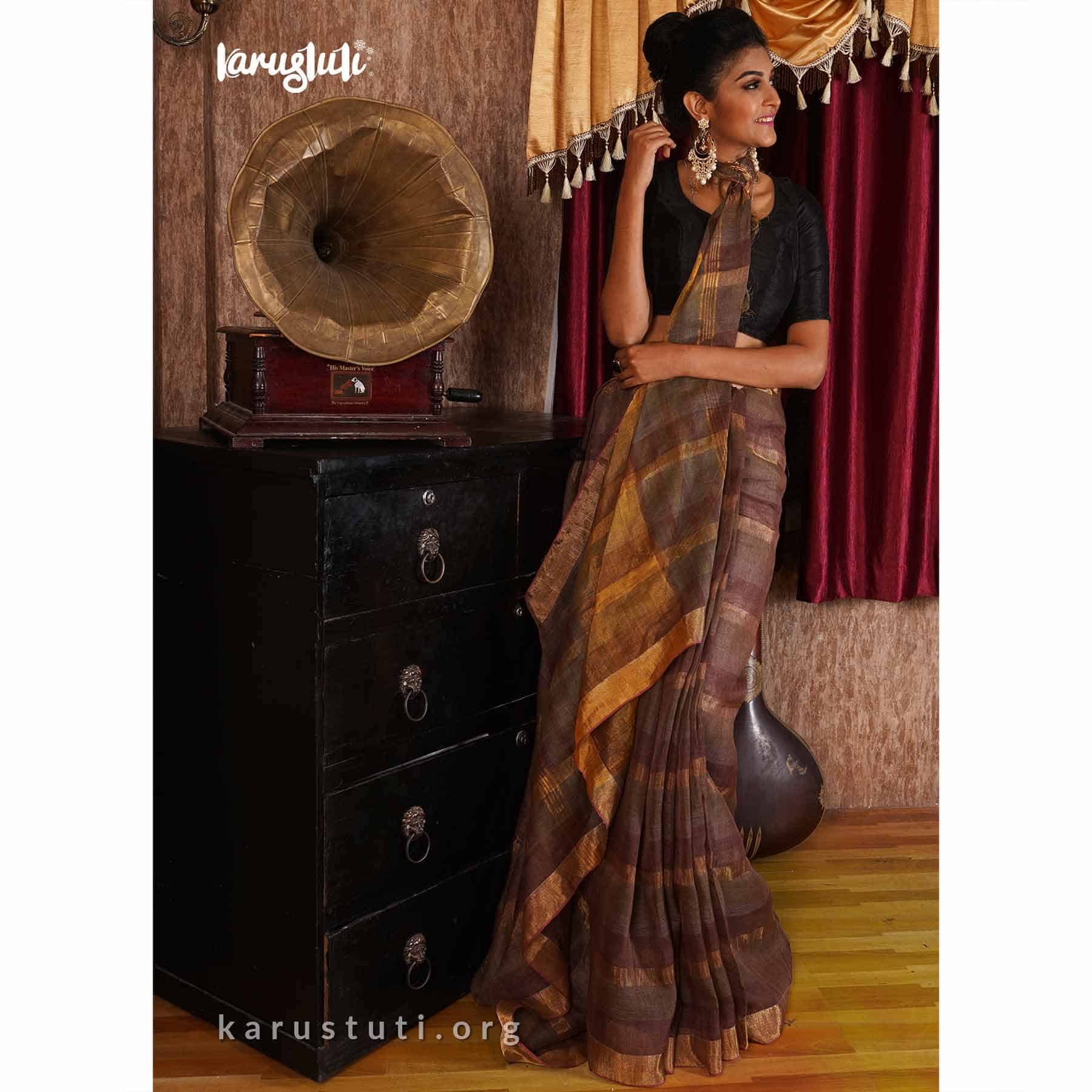 100 CNT FINE LINEN HANDLOOM SAREE WITH MULTI CHECKS DESIGN PATTERN THROUGH ALL OVER SAREE. TESTED ZARI WEAVED IN PALLU. THIS SAREE TAKE 4 DAYS TO COMPLETE. AZO & PCP FREE COLOR, A SMART PIECE FOR any time. STARCH NOT REQUIRE