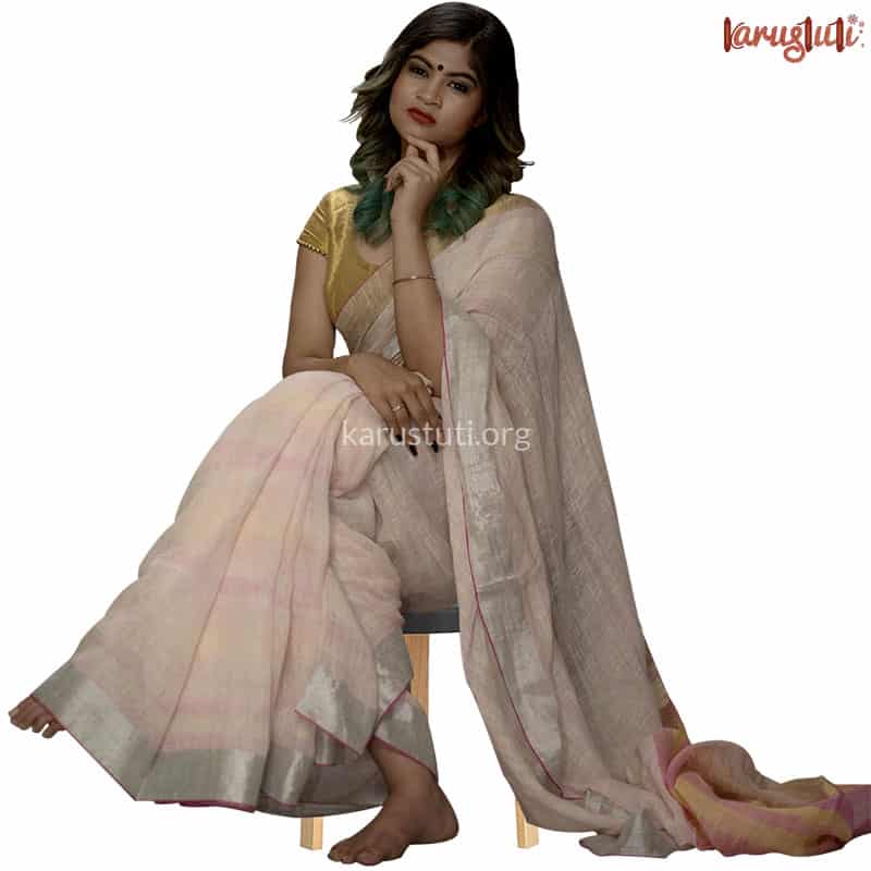 100cnt premium linen handloom saree. Nicely woven pastel-shaded of pink and yellow gives a muted ombre shade all over the saree, along with gold and silver (tested silk zari) border and tissue pallu. Light and nature-friendly color .for every occasion also for every climate. starch not require.