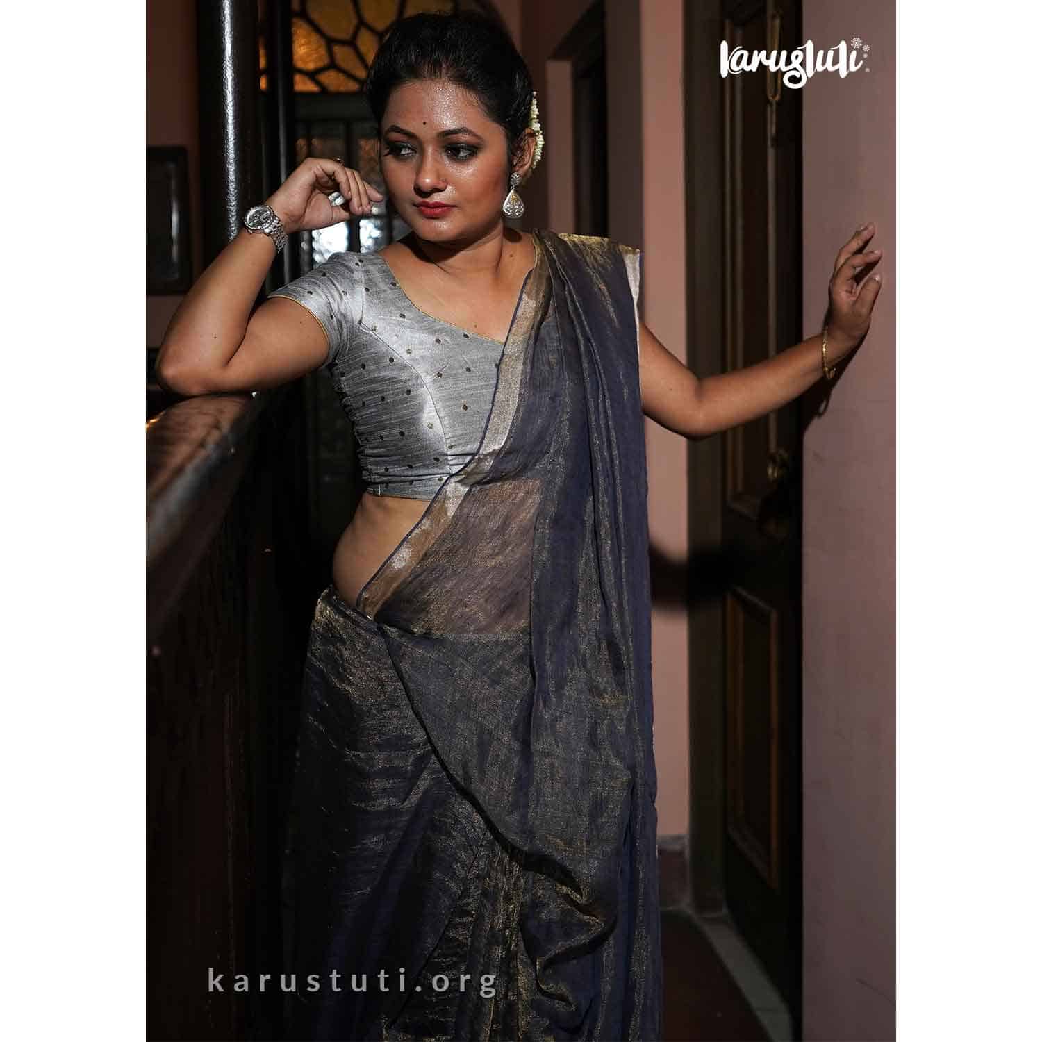 Premium linen with gold tested zari in weft this saree known as linen zari saree. the highest count of linen with shade of dark blue with gold sheen gives very delicate and light-weight feel, An extraordinary classy linen saree for festive party. This saree takes 8 days to complete, Delicate ultimate fashion for the party. AZO and PCP free non-allergic colour.