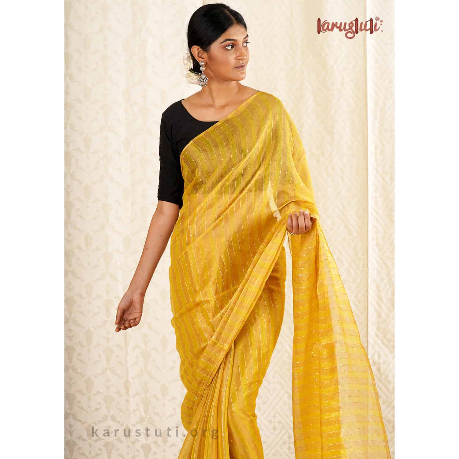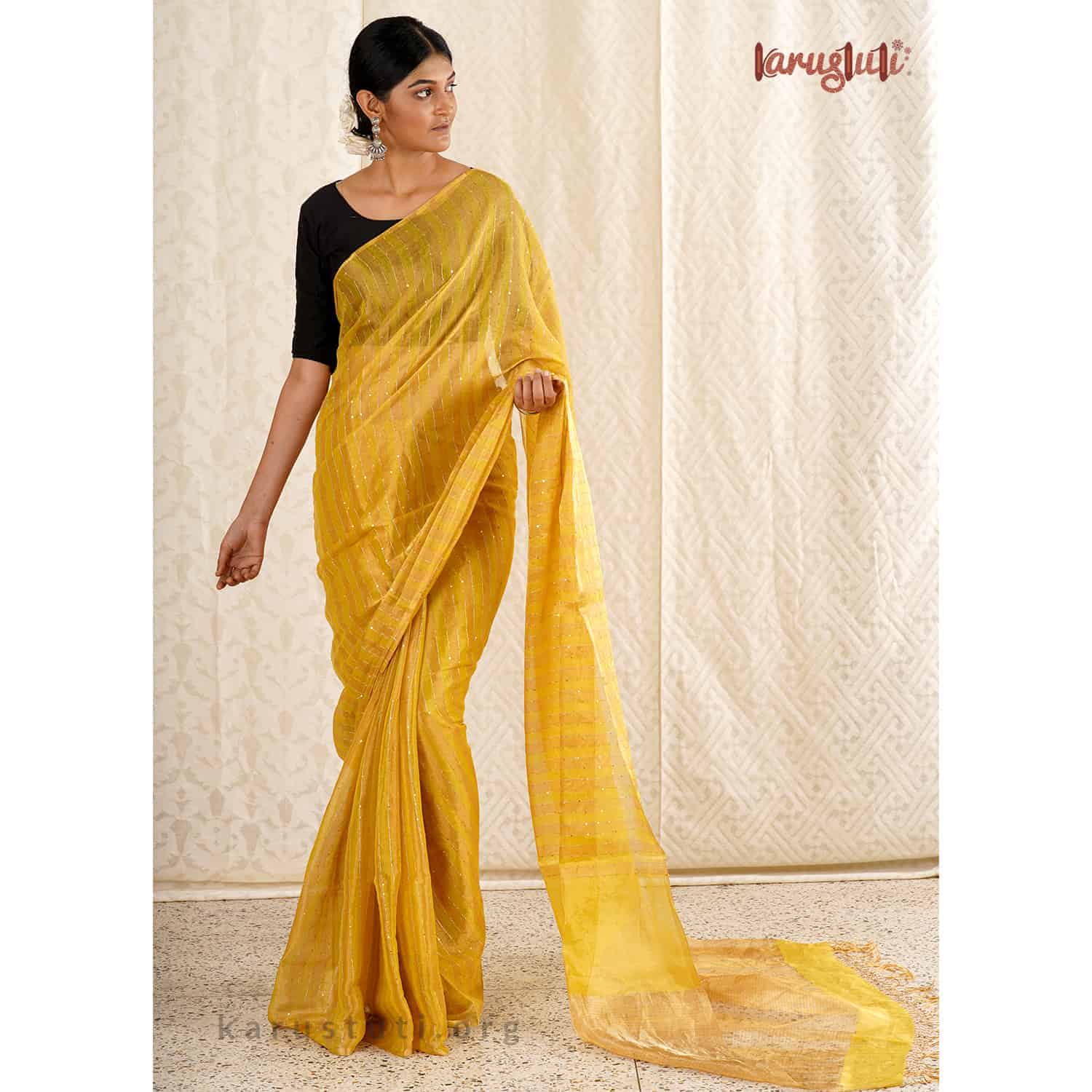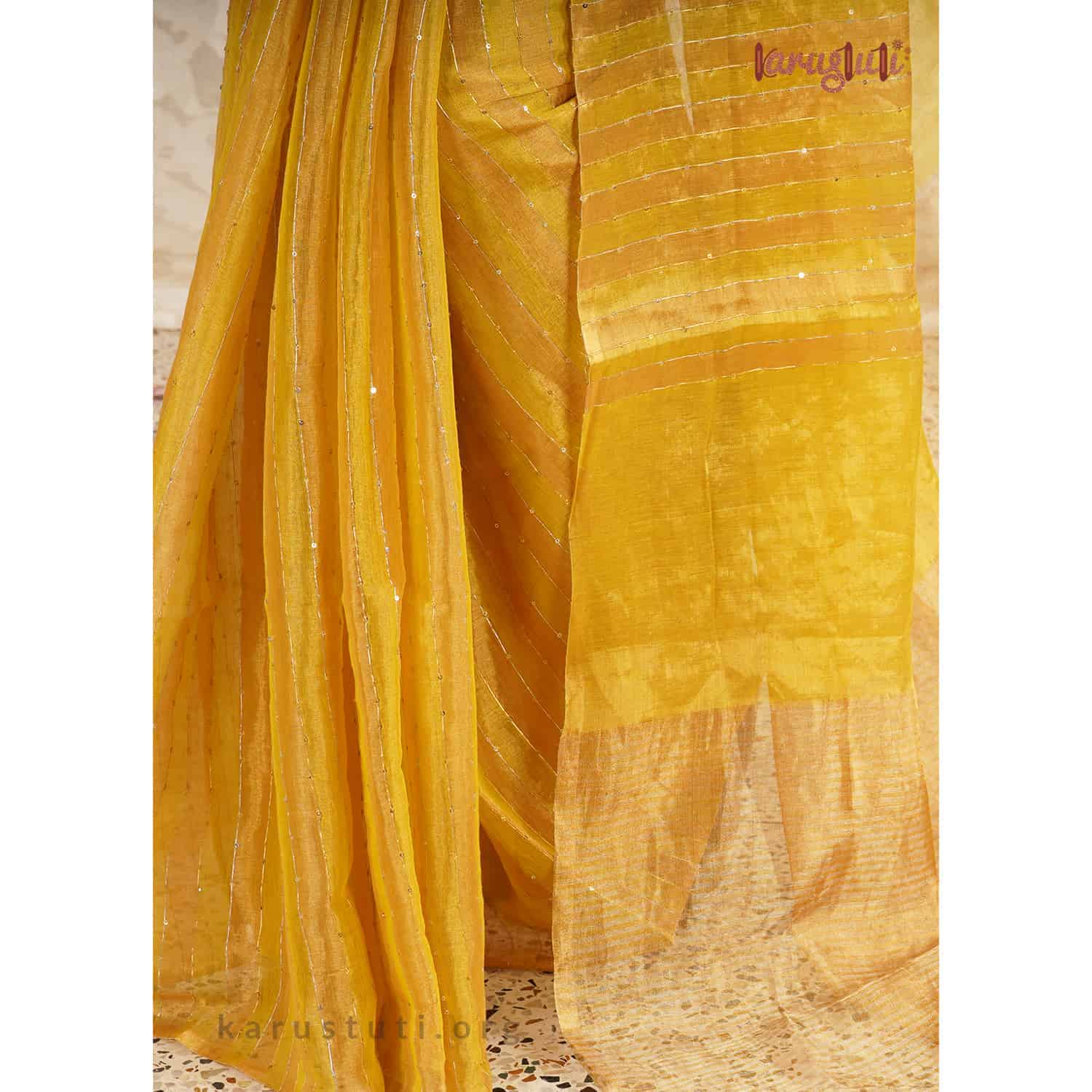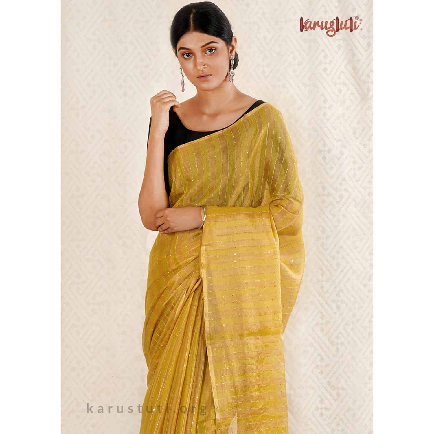 Created out of silk zari in warp and weft by fine linen, this is a Metallic saree with a half and half horizontal design embellished with stripes texture and sequin work. It is made out of the highest count of linen with a shade of gold and silver zari, which gives a pretty sheen to it. It is very delicate and has a light-weight feel. This extraordinary linen saree has been created over 8 days. It is a delicate, and an ultimate fashion staple for the party. It is created out of AZO and PCP free non-allergic color.