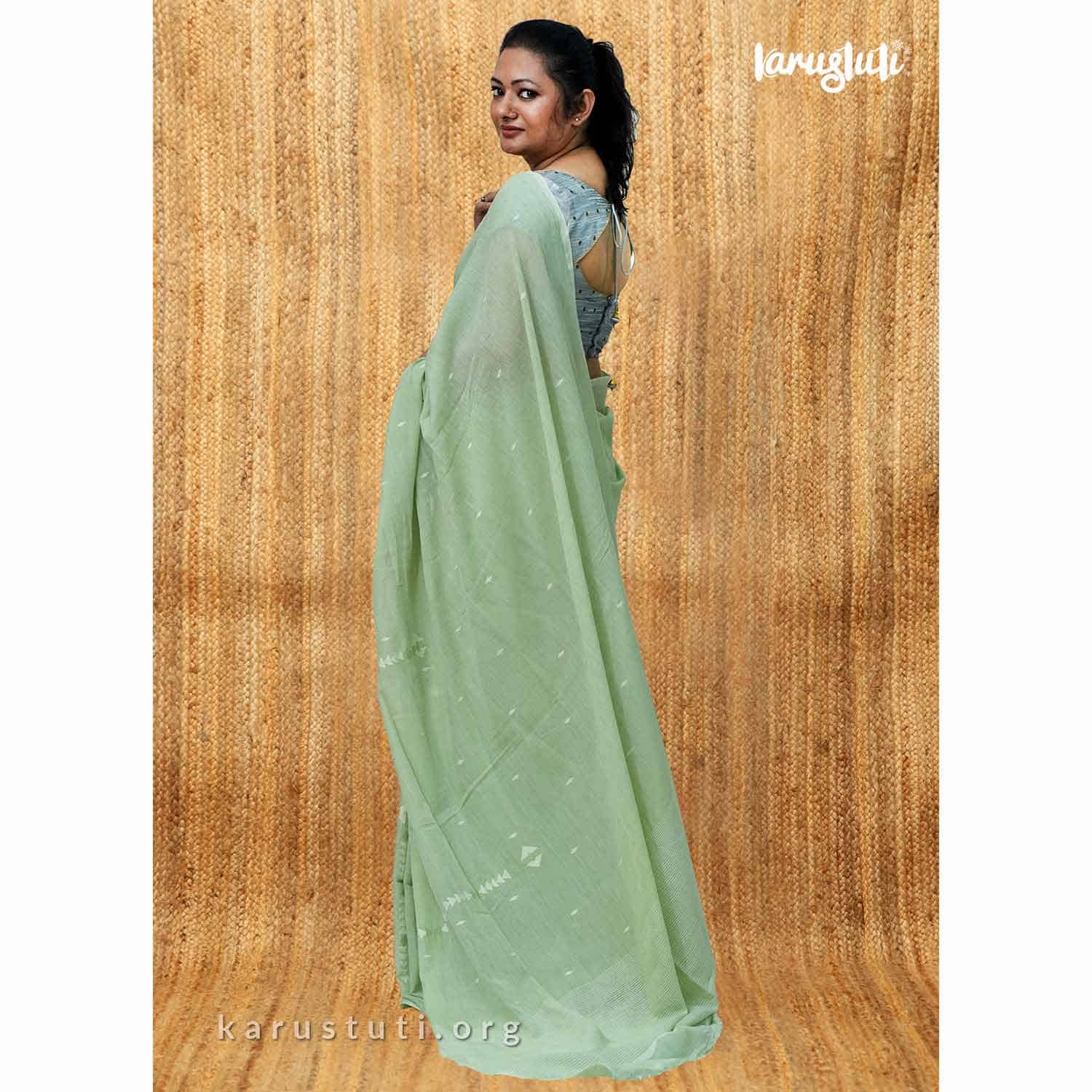 Fine hand spun cotton with handwoven jamdani motif weaving all over the saree along with geometric pallu. Elegant summer cotton for handllom lovers. This saree take 6 to 8 days to complete. Azo and pcp free color, starch not require.
