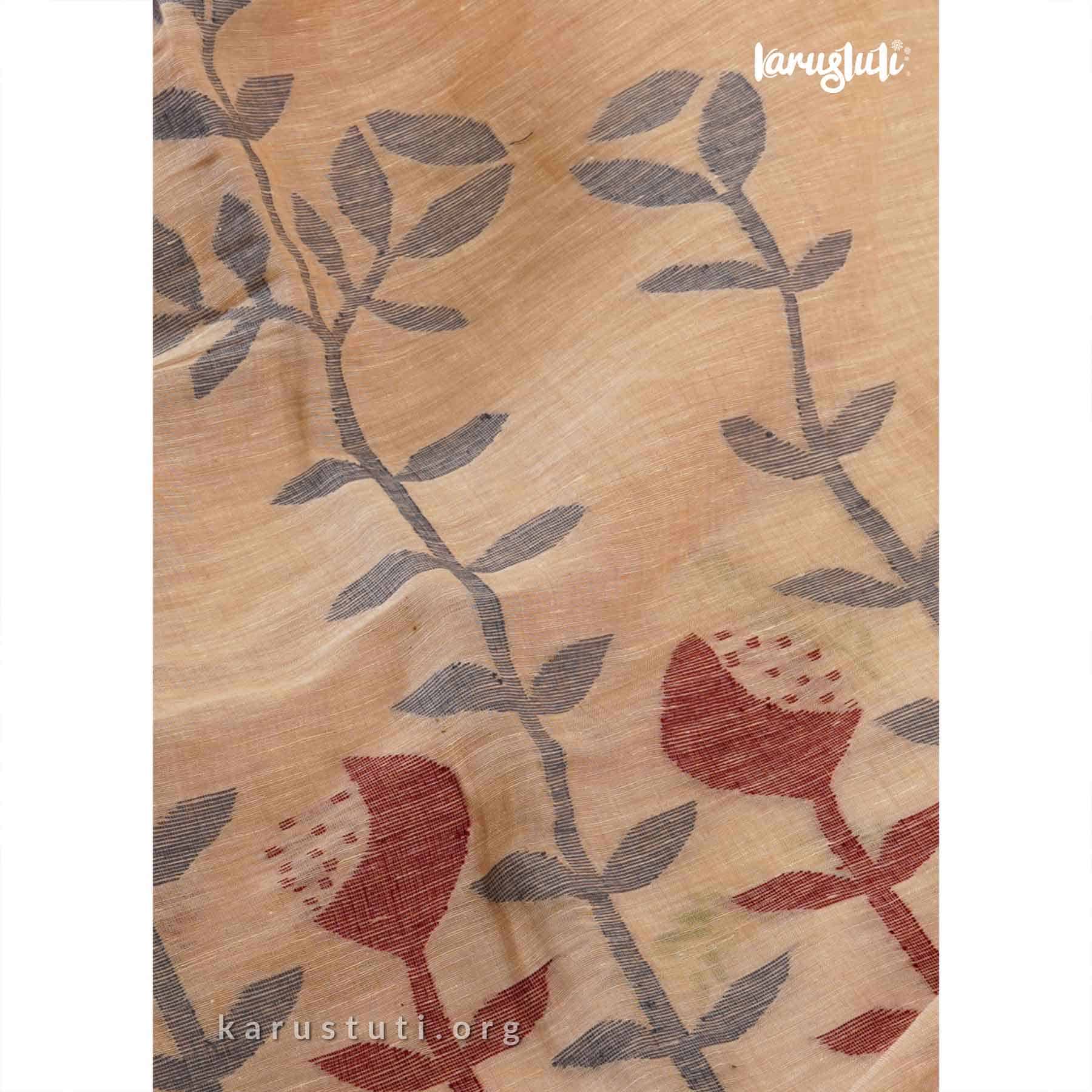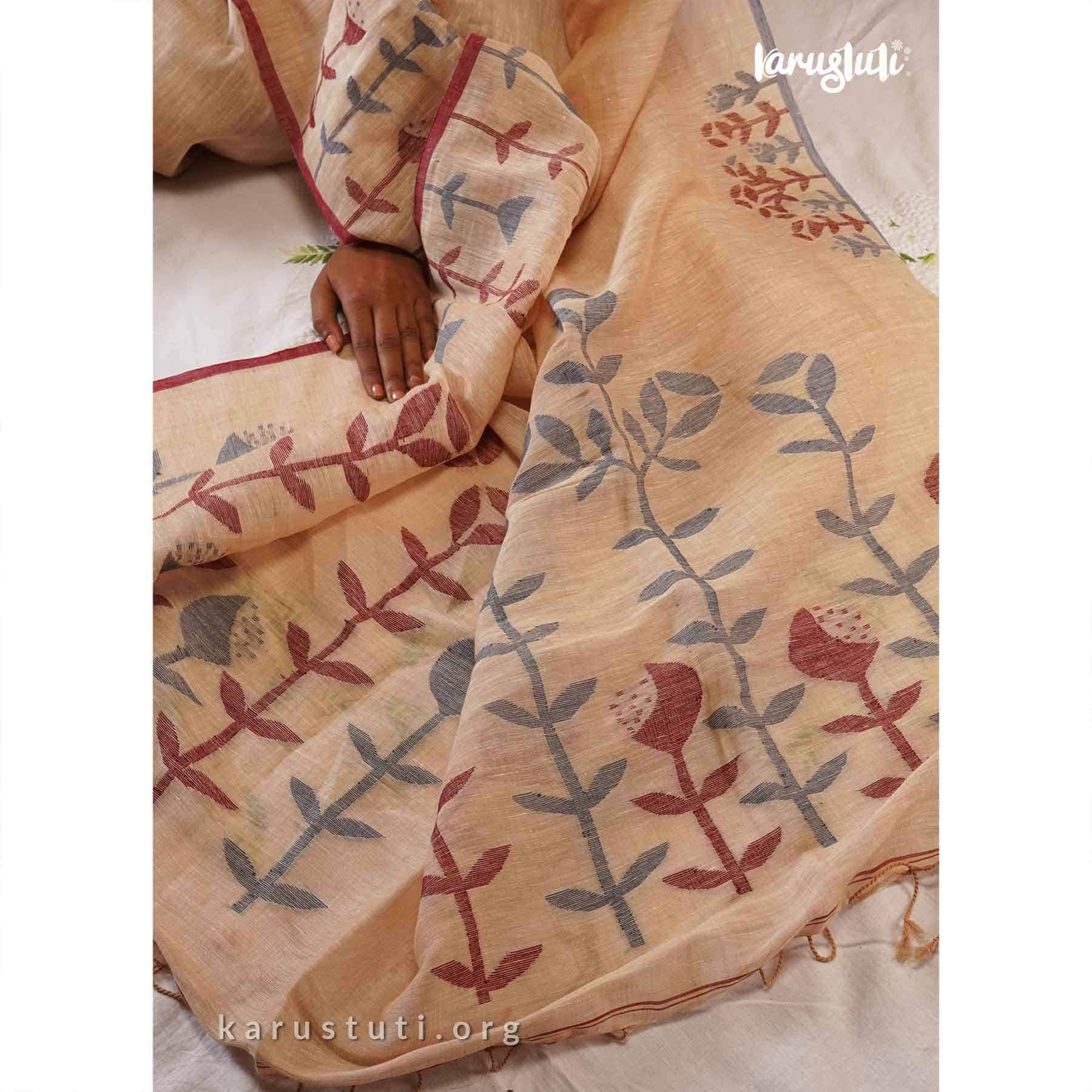 An 80 Lea linen saree with handwoven floral design in the border and a delicate floral woven pallu – this Linen Jamdani Saree is classy, soft, airy and breathable on a whole new level. This masterpiece has been created over a period of 10 days and is made out of AZO and PCP free colour.