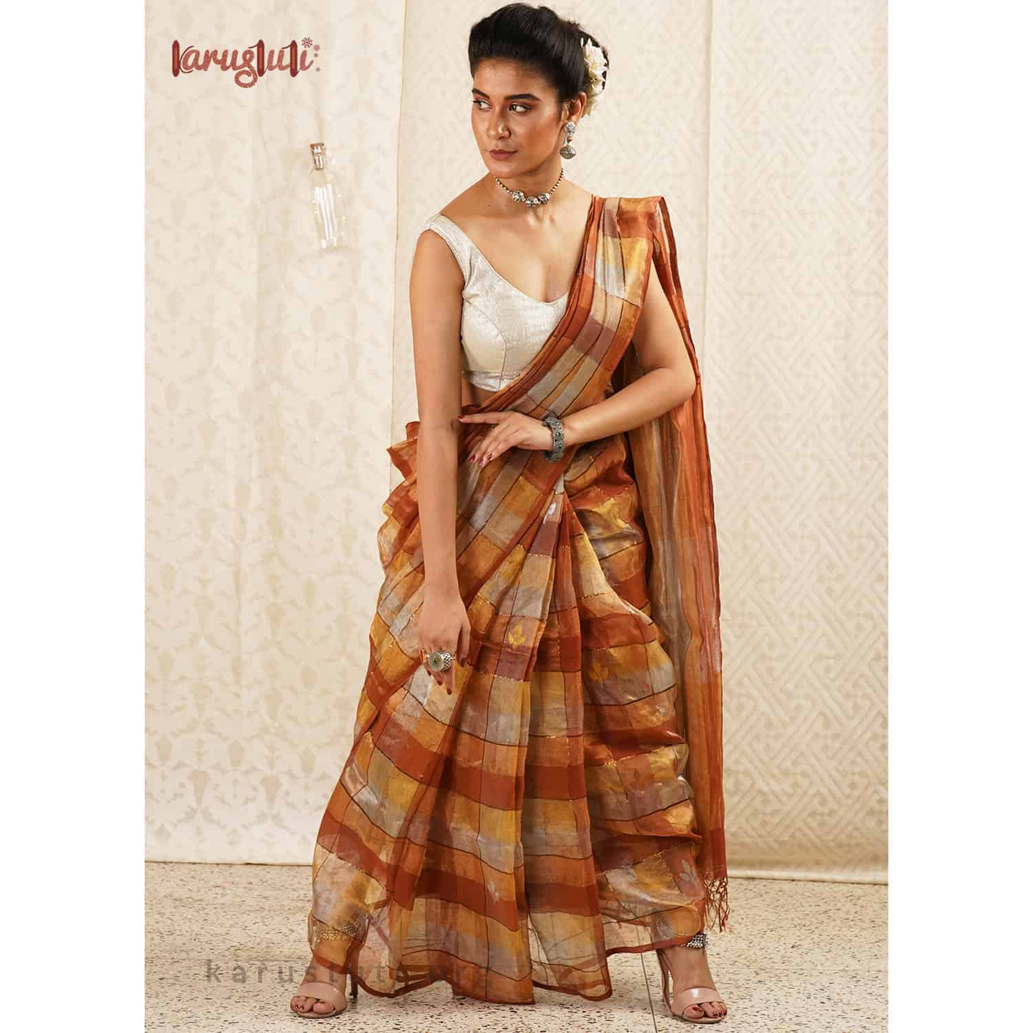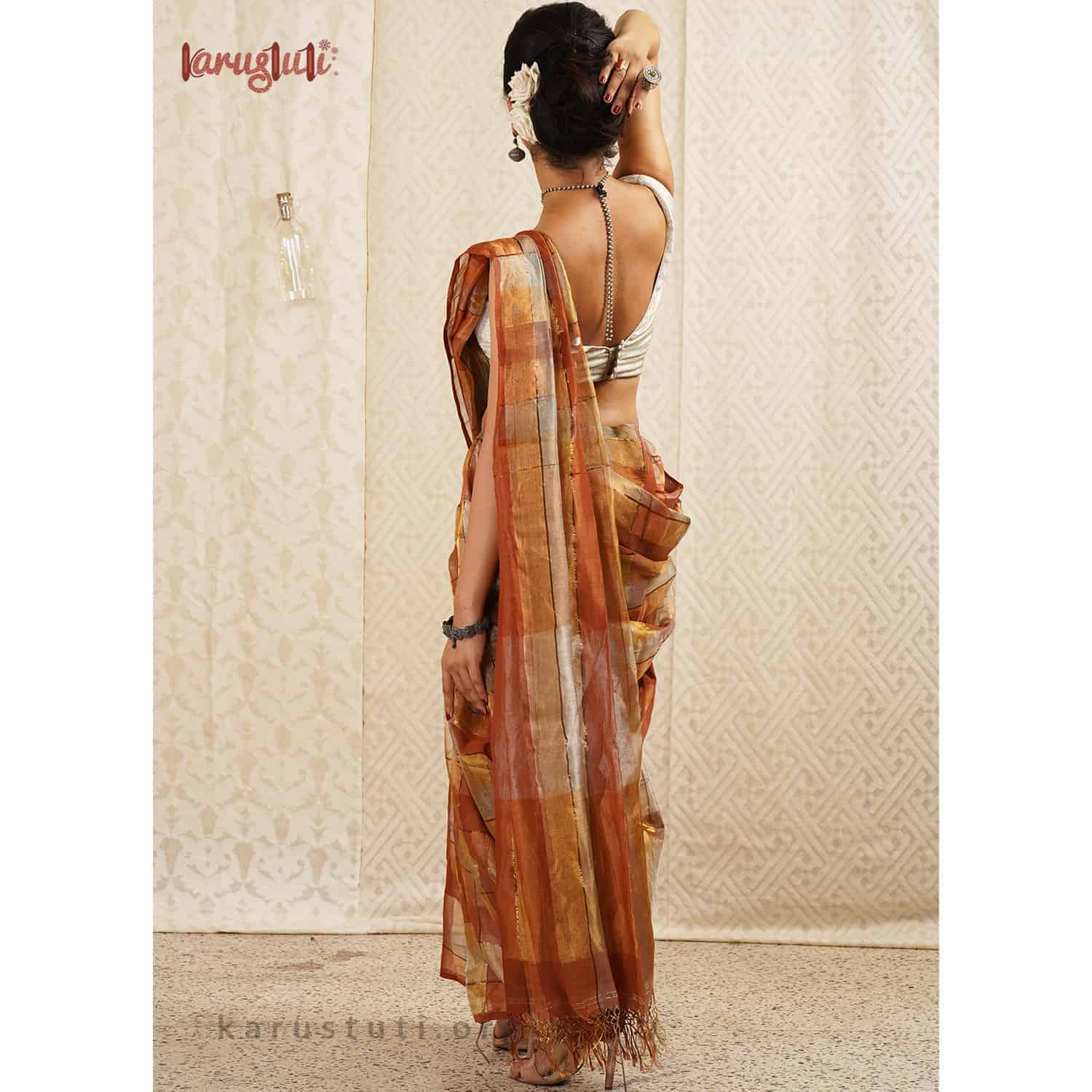 Created out of silk zari in warp and weft by fine linen, this is a Metallic saree with a half and half horizontal design embellished with stripes texture and sequin work. It is made out of the highest count of linen with a shade of gold and silver zari, which gives a pretty sheen to it. It is very delicate and has a light-weight feel. This extraordinary linen saree has been created over 8 days. It is a delicate, and an ultimate fashion staple for the party. It is created out of AZO and PCP free non-allergic color.